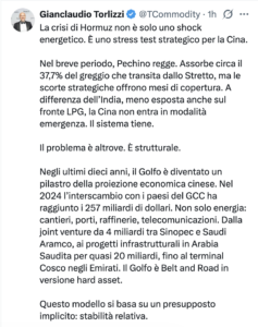 La crisi nello Stretto di Hormuz sta rapidamente evolvendo da un violento shock energetico a un vero e proprio stress test per la tenuta geopolitica e industriale della Cina. Nonostante Pechino appaia resiliente nell’immediato, la sistematica estensione del conflitto verso le infrastrutture civili e i nodi energetici del Golfo sta minando le fondamenta della sua proiezione esterna. L’analisi di questo scenario proviene da Gianclaudio Torlizzi, Fondatore di T-Commodity e Consigliere del Ministro della Difesa, che attraverso un approfondito intervento sul proprio profilo X ha delineato come la stabilità degli investimenti cinesi sia oggi il vero punto di rottura del sistema.