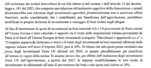 La proroga temporale è accompagnata da una “stretta protezionistica”. Come esplicitato nella relazione tecnica all’emendamento 4.1000, visionata da Energia Oltre, l’accesso agli incentivi è ora condizionato “alla circostanza che gli investimenti abbiano ad oggetto beni Made in Eu”. Il nuovo schema di deducibilità per gli investimenti europei effettuati nel triennio 2026-2028 prevede maggiorazioni pari al 180% del costo d’acquisto per investimenti fino a 2,5 milioni di euro, al 100% per la fascia tra 2,5 e 10 milioni di euro, e al 50% per quella tra 10 e 20 milioni di euro. La relazione tecnica specifica inoltre che per la quota di investimenti eccedente il limite di 20 milioni di euro non è prevista alcuna maggiorazione della deducibilità delle quote di ammortamento.