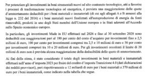 La proroga temporale è accompagnata da una “stretta protezionistica”. Come esplicitato nella relazione tecnica all’emendamento 4.1000, visionata da Energia Oltre, l’accesso agli incentivi è ora condizionato “alla circostanza che gli investimenti abbiano ad oggetto beni Made in Eu”. Il nuovo schema di deducibilità per gli investimenti europei effettuati nel triennio 2026-2028 prevede maggiorazioni pari al 180% del costo d’acquisto per investimenti fino a 2,5 milioni di euro, al 100% per la fascia tra 2,5 e 10 milioni di euro, e al 50% per quella tra 10 e 20 milioni di euro. La relazione tecnica specifica inoltre che per la quota di investimenti eccedente il limite di 20 milioni di euro non è prevista alcuna maggiorazione della deducibilità delle quote di ammortamento.