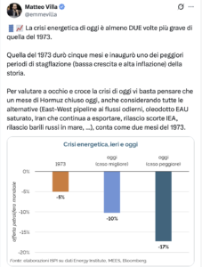 Secondo Matteo Villa dell’ISPI, la crisi attuale è “almeno due volte più grave di quella del 1973”. Sebbene il PIL mondiale dipenda oggi meno dal petrolio in termini relativi, Villa sottolinea che petrolio e gas mantengono lo stesso peso nel mix energetico globale di cinquant’anni fa. Il dato più critico riguarda i trasporti: se nel 1973 il petrolio muoveva il 96% delle merci, oggi la quota è scesa solo al 93%. L’analista di ISPI spiega che “un mese di Hormuz chiuso oggi conta come due mesi del 1973”, evidenziando come la paralisi logistica attuale sia decisamente più impattante rispetto ai cinque mesi di stagflazione vissuti negli anni Settanta.