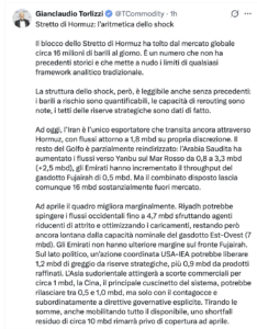 Gianclaudio Torlizzi, fondatore di T-Commodity e consigliere del Ministro della Difesa, definisce la situazione come “l’aritmetica dello shock”. Secondo la sua analisi, il blocco di Hormuz ha sottratto circa 16 milioni di barili al giorno (mbd) dal mercato globale. Anche ipotizzando un parziale reindirizzamento dei flussi — con l’Arabia Saudita che sposta 3,3 mbd verso il Mar Rosso e gli Emirati che saturano il gasdotto Fujairah — lo shortfall residuo resta enorme.