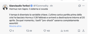 L’aspetto più critico della crisi risiede nella fine della cosiddetta “inerzia del sistema”. Secondo l’analisi di Gianclaudio Torlizzi, fondatore di T-Commodity e consigliere del Ministro della Difesa, l’ultimo carico di greggio partito prima dello shock del 28 febbraio arriverà a destinazione intorno al 20 aprile. “Da quel momento, i barili pre-shock saranno completamente assorbiti dalla catena globale ed inizierà la realtà”, avverte l’esperto.